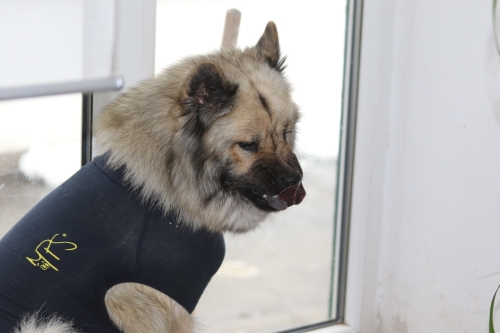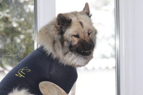 Die Welpen müssen meistens Abstand halten, Bellas Laune ist extrem wechselhaft. Außerdem bestimmt sie selbst, wann mit ihr gespielt werden darf. Wenn sie den Body trägt, dann ist sie unausstehlich. Den braucht sie aber, damit sie sich selber keine Fäden zieht (was sie durchaus versucht).