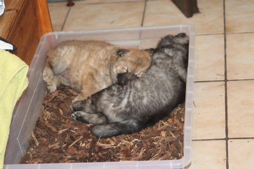 Alle möglichen Schlafplätze werden ausprobiert. Die Kiste mit Rindenmulch sollte eigentlich als Toilette dienen. Aber das haben sie erst drei Wochen später erkannt. Zum Schlafen war die jedenfalls toll und sehr beliebt.