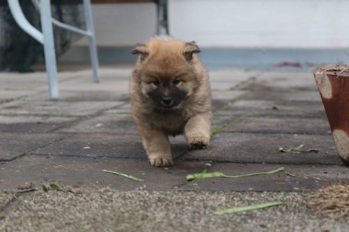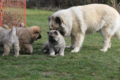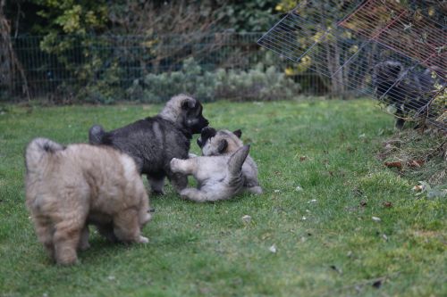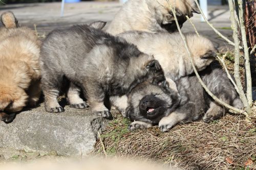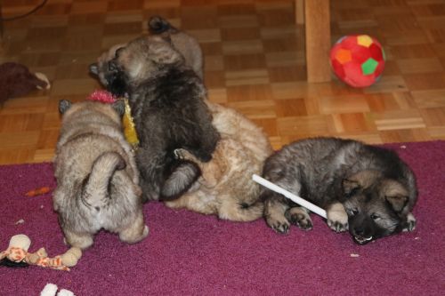 Das findet sie gar nicht toll und sie wird sehr unduldsam den Welpen gegenüber. Besonders nachts fordert sie zähnefletschend und knurrend Ruhe. Die Welpen halten meist respektvoll Abstand. Für die Welpen ist diese Woche damit ein wenig anstrengend. Bisher waren sie es gewöhnt, immer noch sehr viel bei Bella zu trinken. In dieser Hinsicht war Bella sehr gnädig. Adas und Ashes Ohren stehen im Laufe der Woche perfekt - bei Ada schon sehr lange, bei den übrigen sehen sie sehr vielversprechend aus. Diese Woche wird zum Glück das letzte Mal entwurmt. Zum Wiegen fahren wir regelmäßig zum Fressnapf, da funktioniert das am Besten und die Kleinen haben eine nette nicht zu lange Autofahrt. Auch die Schule besuchen sie abwechselnd. Die Schüler dort hätten sie am liebsten im Unterricht. Der Garten wird umgestaltet, sie betätigen sich sehr fleißig mit Tiefbauarbeiten. Besonders beliebt sind die Treppen zur Terasse.