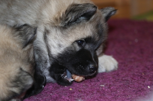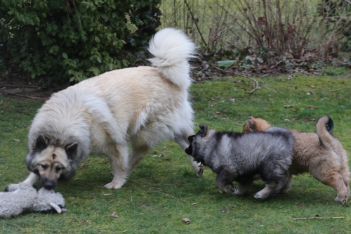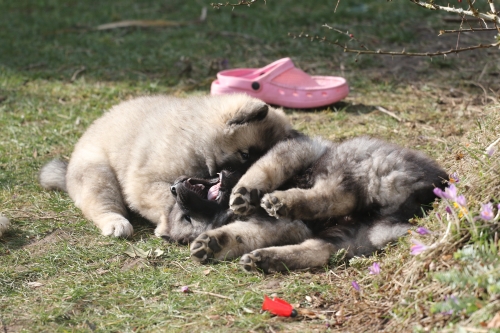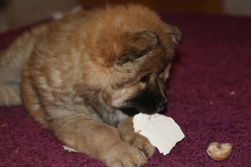 Zur Beschäftigung dürfen sie das Lammfell zerrupfen, das sie leider unbemerkt im Haus auch schon in der Mangel hatten. Bemerkt hatte ich das unglücklicherweise erst, als es sich in der Waschmaschine ziemlich aufgelöst hat und die Waschmaschine damit erstmal lahmgelegt hat. Zum Glück sind die Welpen inzwischen fast komplett stubenrein. Damit fällt nicht mehr soviel Wäsche an.