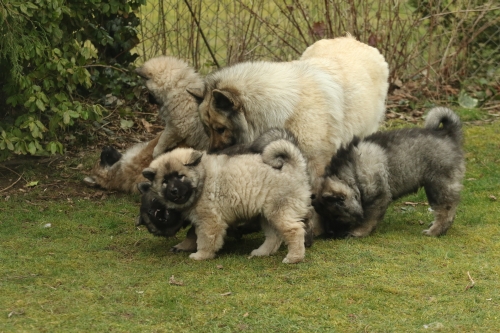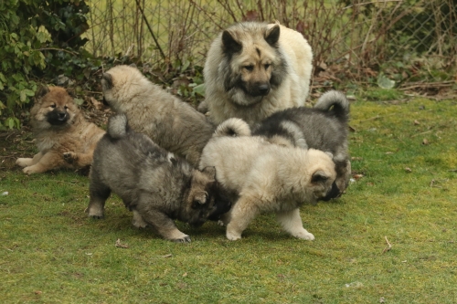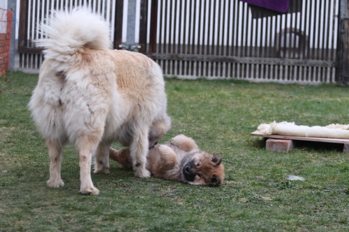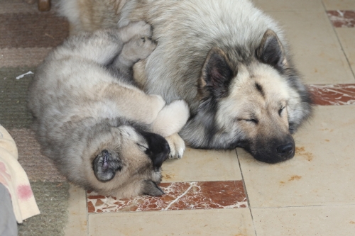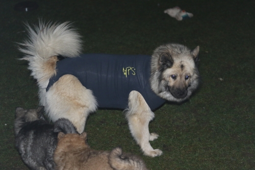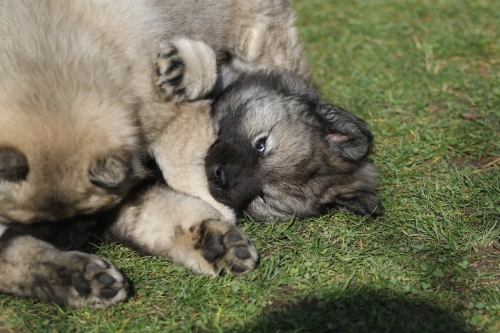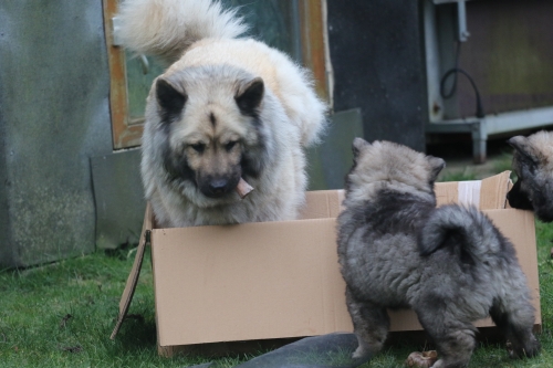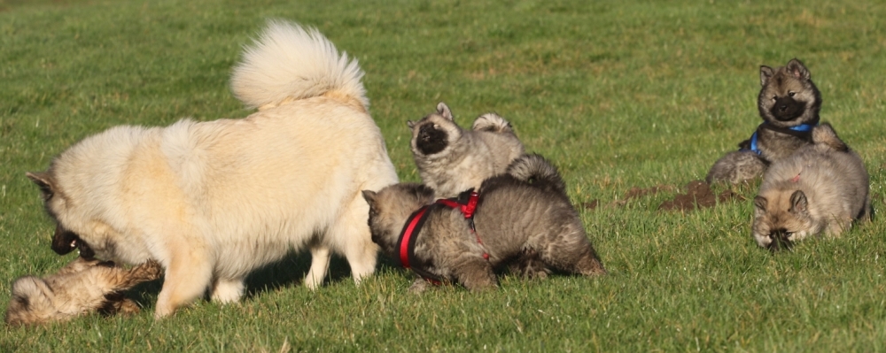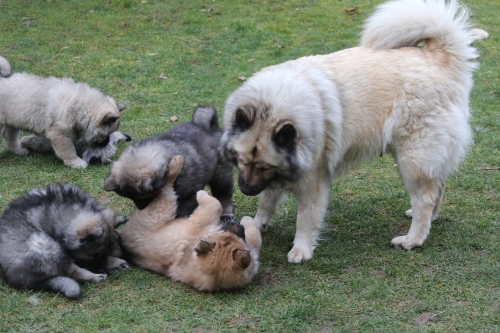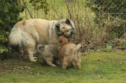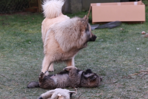 Nachts ist das Verhältnis von Bella zu den Welpen recht gespannt. Sie lässt sie kaum in die Nähe. Tagsüber spielt sie viel mit ihnen.