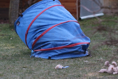 Der Tunnel wird zweckentfremdet. Durch draufspringen kann man den ganz platt machen. Manchmal stellt er sich dann unerwartet auf. In den Karton passt sogar Bella rein.