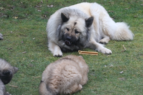 Als gute Mutter bringt man den Welpen auch ein wenig Geduld und den Umgang mit frustrierenden Momenten bei. Das geht besonders gut beim Verspeisen von Kaustangen. Zuschauen ist erlaubt, aber sie müssen Abstand halten.