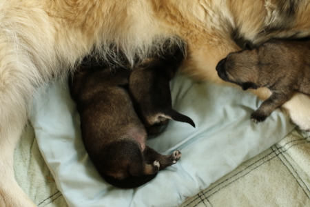 Die zweite Lebenswoche der Welpen verspricht ruhiger zu werden. Ada geht es gut, bis zum Wochenende hat sie fast ihre Normaltemperatur erreicht. Kein Wert liegt mehr über 39 Grad. Sie geht brav dreimal mit uns spazieren, zum Teil sind wir eine gute halbe Stunde unterwegs. Oft legt sie sich zum Schlafen außerhalb der Wurfkiste in eine Ecke. Ihre Mutter Bella darf immer noch nicht in die Nähe der Welpen, aber das kennen wir schon. Bella muss sich wahrscheinlich gedulden bis die Kleinen Ausflüge außerhalb der Wurfkiste unternehmen.