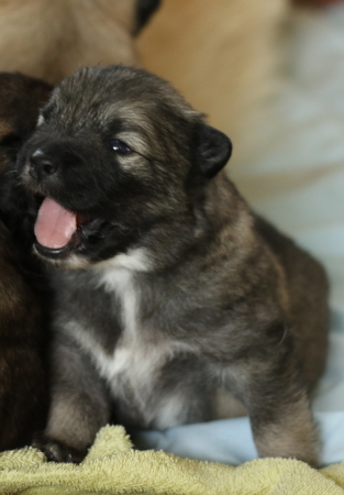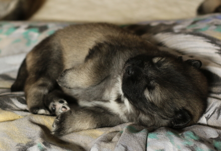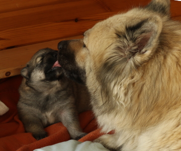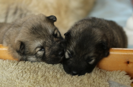 Eigentlich hofften wir ja, dass unsere Welpen uns schon früher anschauen, aber dieses Mal sind sie besonders faul. Cindy machte am 15.Lebenstag endlich die Augen auf, am 16. Tag folgten Cookie und Conny. Cilly schaut uns immer noch nicht an. Sie hat aber wohl zu viel zu tun mit Zunehmen und Großwerden. Das kann sie perfekt. Jetzt wiegt sie schon knapp 2 kg. Aber Cookie strengt sich an und hat ihr Gewicht schon versechsfacht.