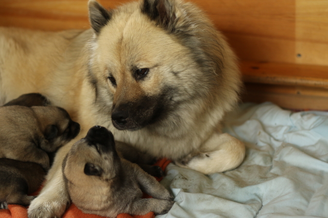 Ada unterstützt das Ganze, sie ist noch fürsorglicher als letztes Mal. Sobald man zu nah an die Wurfkiste kommt, legt sie sich in unmittelbare Nähe und passt auf. Gar nicht gut findet sie es, dass Cilly schon Ausflüge außerhalb der Wurfkiste macht und Cindy wenigstens mal ihr Häufchen ein paar Zentimeter außerhalb der Wurfkiste macht. Aber auch die Vier werden irgendwann mal selbstständig.