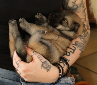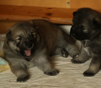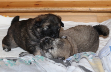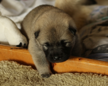 28.10.: Am Freitag abend, 26.10. schaute uns dann Cilly endlich auch an. Alle vier sind zwar noch in der Wurfkiste, aber sie schauen schon gerne über den Rand, wenn wir das oberste Brett entfernen. Lange wird es nicht mehr dauern bis sie Ausflüge im näheren Bereich der Wurfkiste machen. Spielzeug wird nun auch interessant und gerne mal beknabbert. Unter dem Zahnfleisch kann man schon die kleinen Zähnchen spüren.