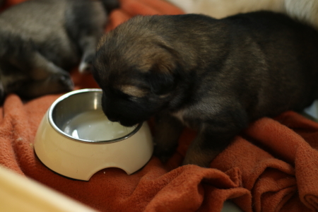 Am 24.10. habe ich zum ersten Mal eine kleine Schüssel mit Ziegenmilch zu den Welpen gestellt. Cilly war die erste, die probiert hat und recht schnell herausgefunden hat, wie man die in den Magen bekommt. Ada durfte dann die Umgebung putzen und die Reste wegschlabbern. Leider war es dann auch. Die übrigen Drei zeigen kein Interesse an allem, was nicht aus Ada kommt. So einen faulen Wurf hatte ich doch tatsächlich noch nie. Selbst gespielt wird am liebsten in der Wurfkiste im Sitzen.