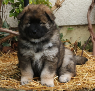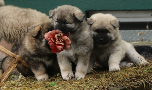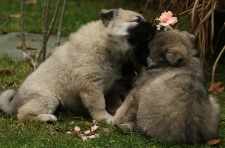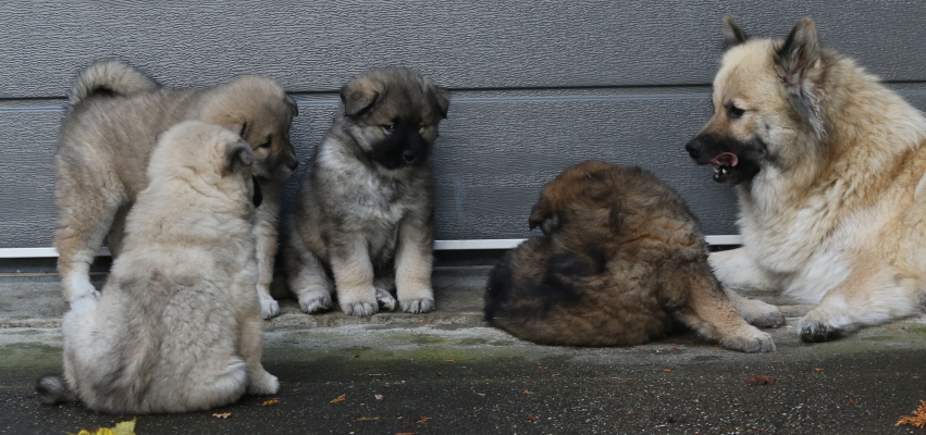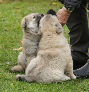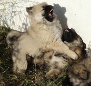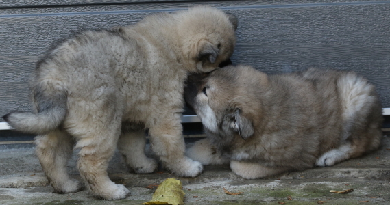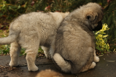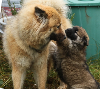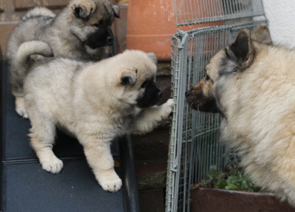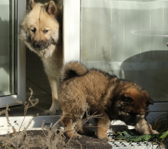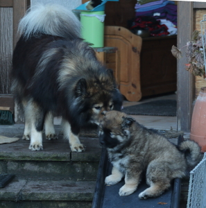 Am Wochenende haben wir viel Besuch. Mika (Baghira aus unserem B-Wurf) war noch einmal zu Besuch da. Dieses Mal waren die Kleinen auch alt genug, so dass er seine Halbgeschwister kennenlernen konnte. Zusammen sind sie stark. Da wird der große Bruder dann auch mal angebellt.