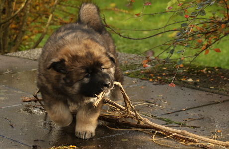 Die Welpen sind jetzt am liebsten draußen. Da gibt es so viel zu entdecken. Nur besonders schlechtes Wetter lässt sie ein wenig zögern. Auf der Terrasse sind sie fleißig am Stauden stutzen. Da gibt es sowieso zu viel Grünzeug. Von unserem Altholzlagerplatz (unter dem ein paar Igel schlafen) schleppen sie immer mal wieder ein paar Äste an.