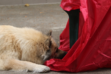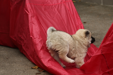 Zum Mittagessen gibt es üblicherweise etwas selbstgekochtes. Als Fleichsorten haben wir Pute, Huhn, Rind und Pferd gefüttert. Natürlich stand auch Fisch auf dem Speiseplan. An Gemüse gab es Staudensellerie (der ist auch roh toll zum Spielen), Karotten, Broccoli, Zucchini, Fenchel, Spinat, Wirsing, Süßkartoffeln, Kartoffeln und alles, was uns sonst in die Hände gefallen ist - natürlich gekocht. Rohe Karotten gibt es später zum Knabbern, wenn die Welpen älter sind. Nudeln, Reis und Spätzle gehören immer mal wieder auf den Speiseplan. Auberginen gibt es bei uns nicht, das Morgens, Abends und Nachts gibt es Welpenfutter. Hier nehmen wir Morgens Nassfutter, Abends und Nachts Trockenfutter. Sie fressen alle gut und man sollte meinen, sie werden davon satt. Leider ist Ada nicht unserer Meinung, deswegen teilt sie üblicherweise ihr Frühstück mit den Kleinen - sie schlingt es also hinunter, holt alle zusammen und würgt es ihnen wieder vor. Hoffentlich hört sie das bald wieder auf. Das rote auf den folgenden Bildern ist ein Kriechtunnel, den wir den Kleinen hingestellt haben. Anfangs sind sie nur darauf herumgesessen.