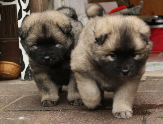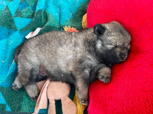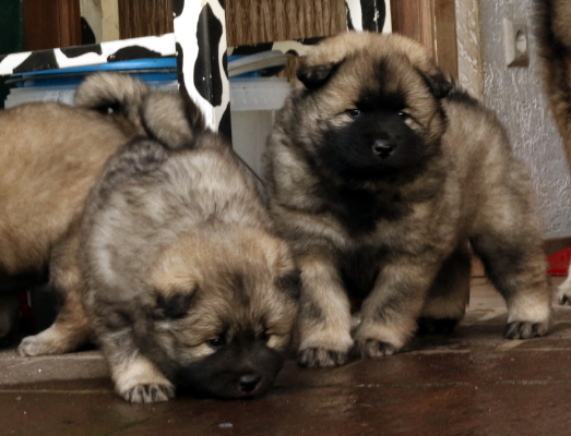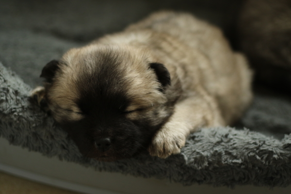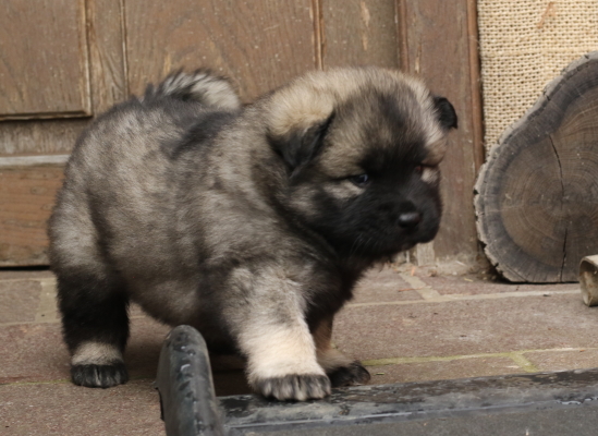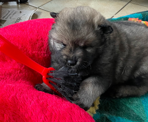 Auf Darius bin ich wirklich gespannt. Unser kleines Bärchen ist der einzige Welpe ohne Maske (sie löst sich gerade auf) und seine Ohren stehen auch schon. Seine Zunge muss ich unbedingt einmal fotografieren. Sie färbt sich gerade schön blau.