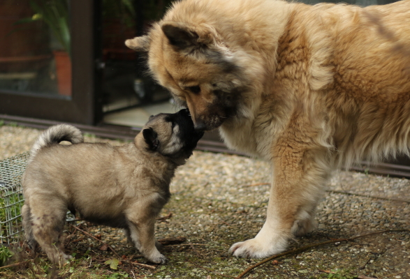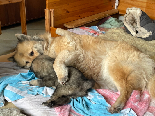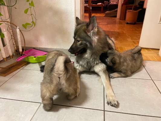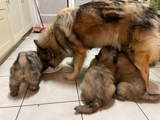 Oma Ada hat sich das Anknabbern verboten. Ihr strenger Blick warnt sie vor, wenn es der ein oder andere übertreibt. Die Milchzähne sind spitz und die Welpen probieren sie an allem aus, was ihnen in die Quere kommt. Aber ansonsten ist es eine Freude zu sehen, wie sich Ada der Welpen annimmt. Sie hat gerne alles im Blick und schläft und kuschelt immer wieder mit den Kleinen. Cookie flüchtet lieber ins Haus, da die Kleinen ständig bei ihr trinken wollen - auch wenn sie gerade keinen Hunger haben können.