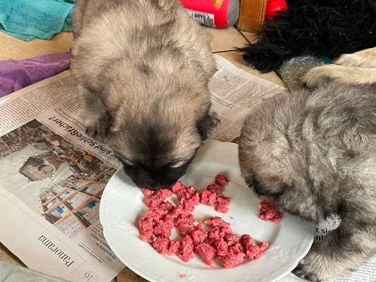 Diese fünfte Woche begann am Donnerstag natürlich wieder mit dem Entwurmen. Da die Kleinen sehr gut fressen (auch wenn sie immer noch an Cookie hängen), konnte ich das Wurmmittel unter das Rinderhackfleisch mischen. Trotz rosa Pampe kam das Rinderhack gut an. Die Kleinen bekommen natürlich nicht nur Welpennassfutter, sondern auch Gemüse, Obst, verschiedene Fleischsorten, Reis, Kartoffeln, ... Ihre Verdauung soll sich nicht nur auf eine Sorte spezialisieren. Wir hoffen damit auch frühzeitig feststellen zu können, wenn sie etwas nicht vertragen.