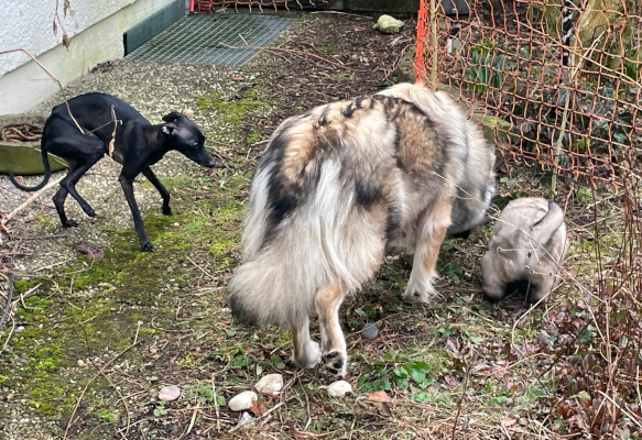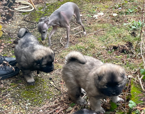 Am Freitag bekamen wir Besuch von meiner Tochter mit ihren beiden italienischen Windspielen Zwiebel und Rosine. Beide fanden die Welpen gruslig. Ada und Cookie hatten kein Problem mit den Beiden. Von den Welpen wurden sie ignoriert.