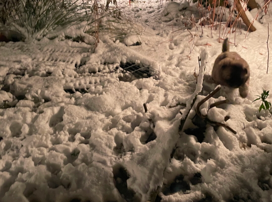 Sonntag Nacht hatten wir einen kleinen Wintereinbruch. Nachts um halb zwei, als die Meute raus zum Pinkeln wollte, war alles verschneit. Die Welpen störte das allerdings nicht, sie marschierten tapfer durch die weißen Massen. Schon am nächsten Morgen war die Hälfte wieder geschmolzen und im Laufe des Tages blieb nur noch Matsch von der Weißen Pracht.