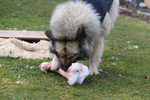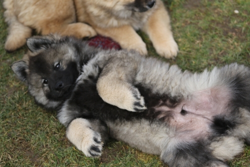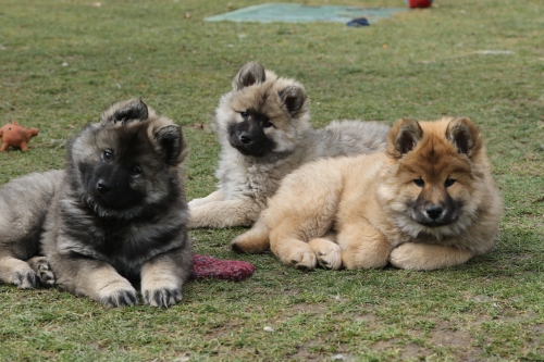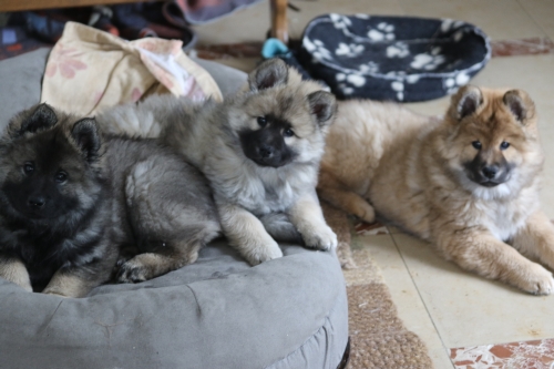 Die zehn Wochen Welpenaufzucht mit einer die meiste Zeit nicht vollständig gesunden Mutter war sehr arbeitsintensiv, nervenaufreibend und kostspielig (die Tierarztkosten waren die größte Ausgabe). Unser Garten sieht aus wie eine Mondlandschaft, die Welpen haben unser Grünzeug massiv reduziert. Natürlich hätten wir ihnen nur einen Teil des Gartens überlassen können (eingezäunt wurden fast nur giftige Pflanzen), aber das habe ich nicht übers Herz gebracht. Sie hatten soviel zu entdecken und wir hatten große Freude dabei, ihnen beim Wachsen und Lernen zuzuschauen. Teppiche, die wir behalten wollten, hatten wir vor der Welpenaufzucht weggeräumt. Sie haben keinerlei Möbel angefressen, noch nicht einmal meinen Schreibtisch, der im Welpenaufzuchtszimmer steht. Ihren Zähnen sind hauptsächlich Kuscheltiere, Kochlöffel, Zahnbürsten, Zeitungen, Kartons und ähnliches zum Opfer gefallen.