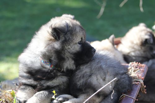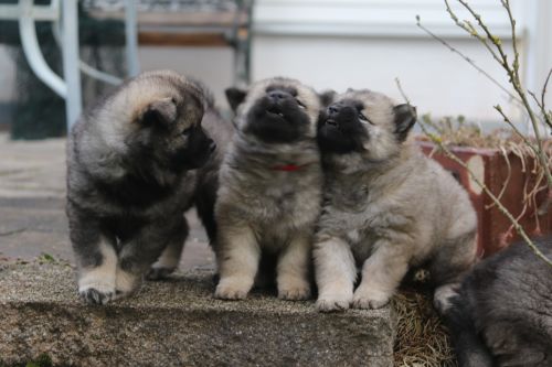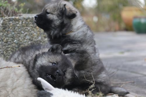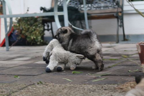 Das findet sie gar nicht toll und sie wird sehr unduldsam den Welpen gegenüber. Besonders nachts fordert sie zähnefletschend und knurrend Ruhe. Die Welpen halten meist respektvoll Abstand. Für die Welpen ist diese Woche damit ein wenig anstrengend. Bisher waren sie es gewöhnt, immer noch sehr viel bei Bella zu trinken. In dieser Hinsicht war Bella sehr gnädig. Adas und Ashes Ohren stehen im Laufe der Woche perfekt - bei Ada schon sehr lange, bei den übrigen sehen sie sehr vielversprechend aus. Diese Woche wird zum Glück das letzte Mal entwurmt. Zum Wiegen fahren wir regelmäßig zum Fressnapf, da funktioniert das am Besten und die Kleinen haben eine nette nicht zu lange Autofahrt. Auch die Schule besuchen sie abwechselnd. Die Schüler dort hätten sie am liebsten im Unterricht. Der Garten wird umgestaltet, sie betätigen sich sehr fleißig mit Tiefbauarbeiten. Besonders beliebt sind die Treppen zur Terasse.