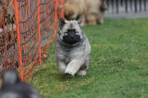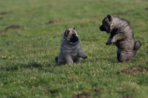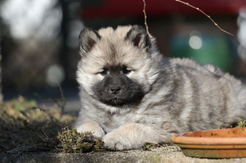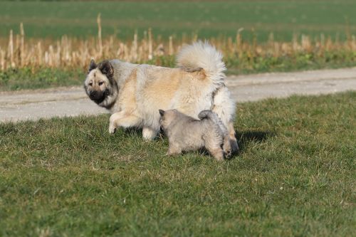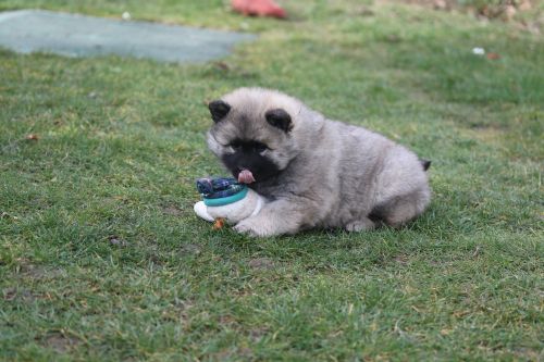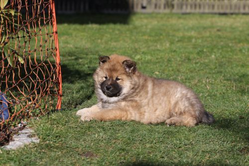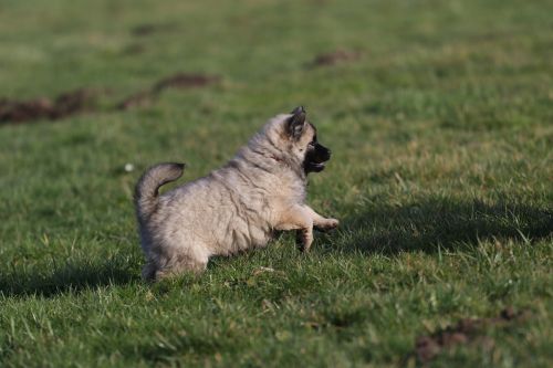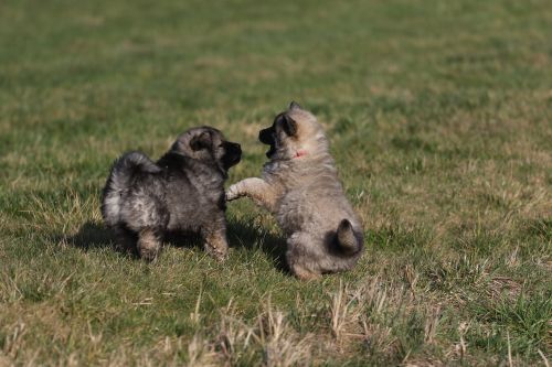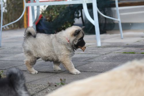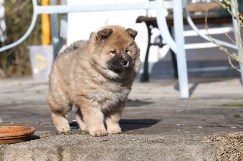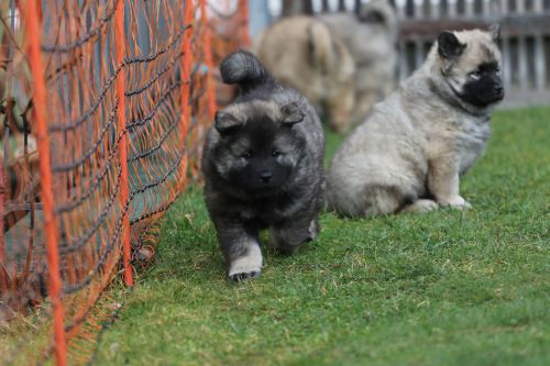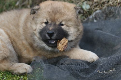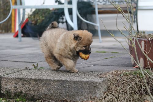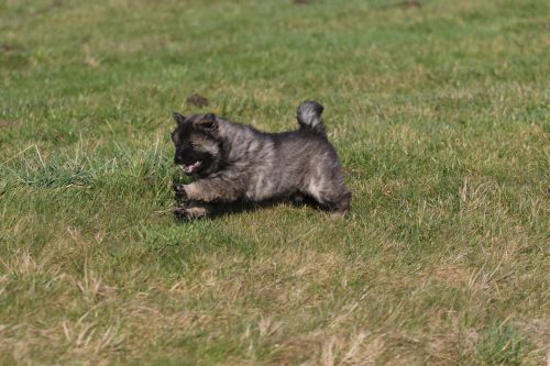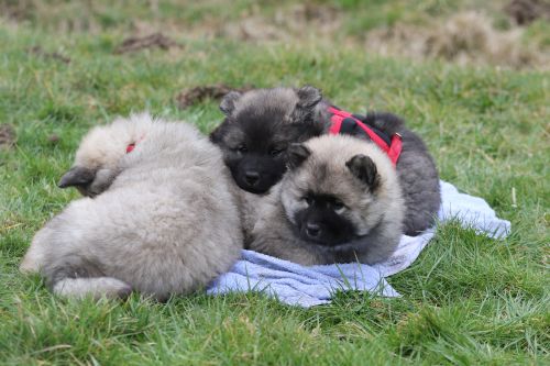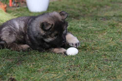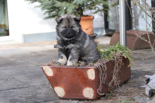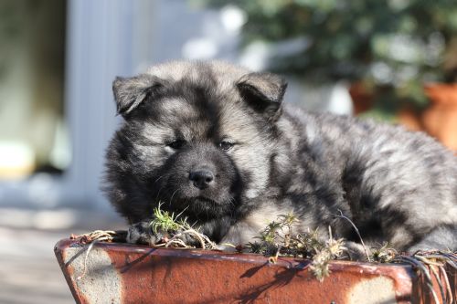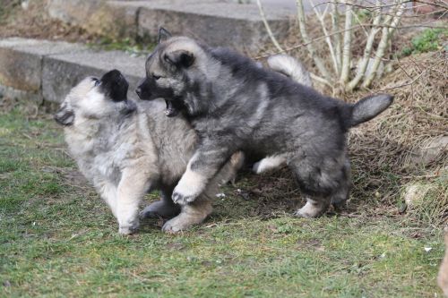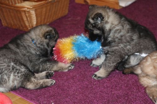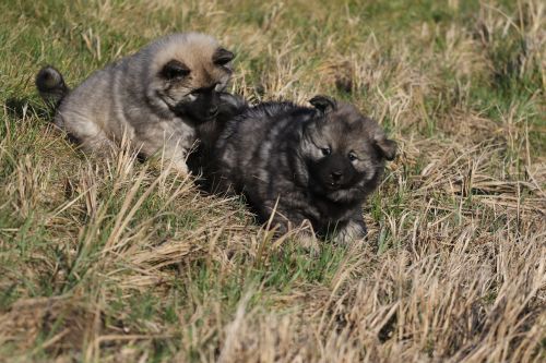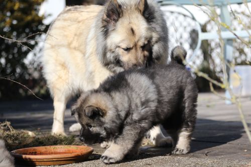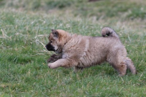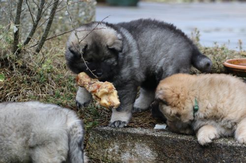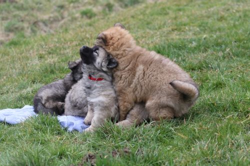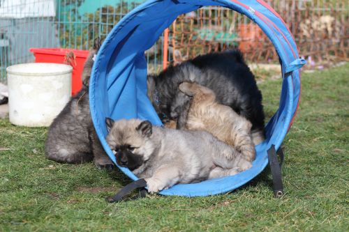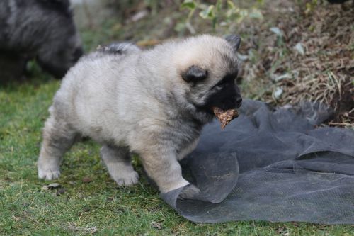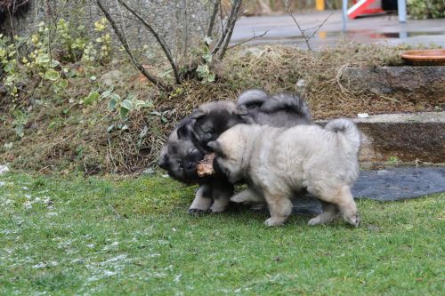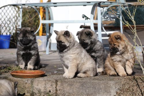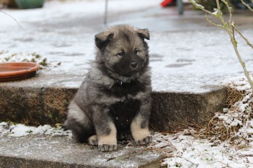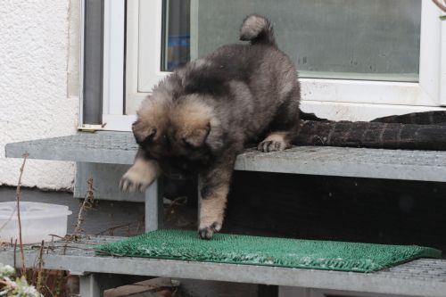 Während der ganzen Welpenaufzuchtzeit haben wir ein sehr wechselhaftes Wetter. Die Bandbreite geht von frühlingshaften Temperaturen mit Sonne bis hin zu Sturmtagen und Schneefällen. Die Welpen dürfen also wettermäßig sehr viel erleben. Bei Sturm gehen sie nachts nicht gerne hinaus. Auch wenn sie die meisten ihrer Geschäfte draußen erledigen, sind sie dann kaum dazu zu bewegen, sich im Garten zu lösen. Mit der Sauberkeitserziehung sind wir eigentlich recht weit, das Zeitungspapier ist für sie das Zeichen, wo sie zur Not hinpinkeln können. Gelegentlich sorgt das Wetter für kleinere Rückschläge.