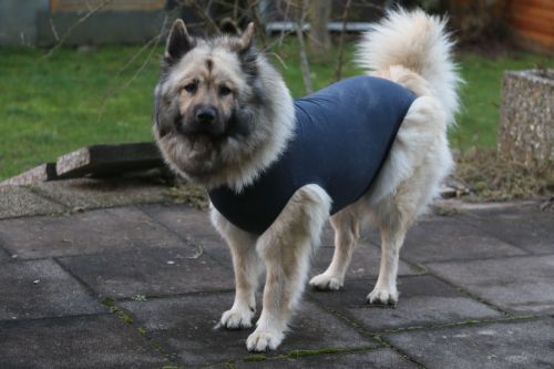 Vroni und Susanne kommen uns am Samstag abend noch besuchen und bringen den Body mit, den man oben auf dem Foto sehen kann. Damit wird es nun deutlich leichter, die Kleinen vom Trinken abzuhalten ohne sie die meiste Zeit zu trennen. Aber Bella wird immer gereizter zu den Welpen. Bisher haben sie im Gang bei Bella geschlafen, nun lassen wir sie einen großen Teil der Nacht im Welpenzimmer. Das ist für alle entspannter. Der Umgang mit den Welpen, die selbstständiger und aufgeweckter werden, ist zwar sehr schön, aber um Bella machen wir uns immer mehr Sorgen.