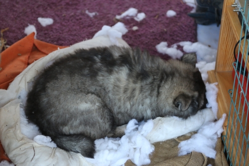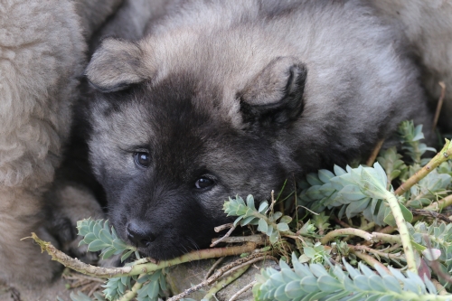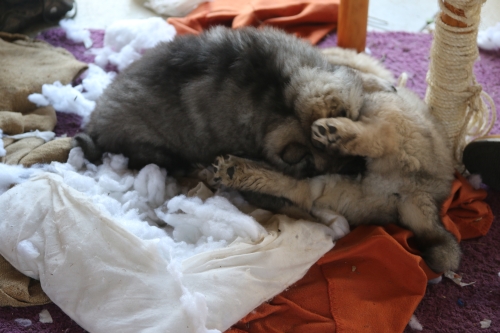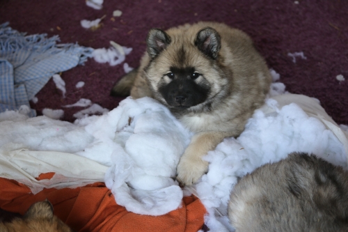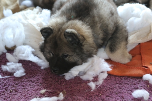 Zur Beschäftigung dürfen sie das Lammfell zerrupfen, das sie leider unbemerkt im Haus auch schon in der Mangel hatten. Bemerkt hatte ich das unglücklicherweise erst, als es sich in der Waschmaschine ziemlich aufgelöst hat und die Waschmaschine damit erstmal lahmgelegt hat. Zum Glück sind die Welpen inzwischen fast komplett stubenrein. Damit fällt nicht mehr soviel Wäsche an.