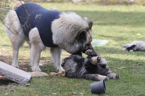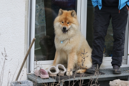 Als gute Mutter bringt man den Welpen auch ein wenig Geduld und den Umgang mit frustrierenden Momenten bei. Das geht besonders gut beim Verspeisen von Kaustangen. Zuschauen ist erlaubt, aber sie müssen Abstand halten.