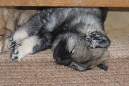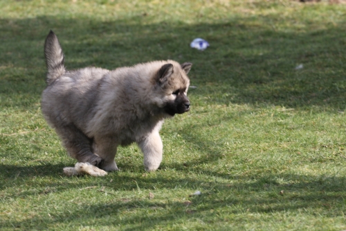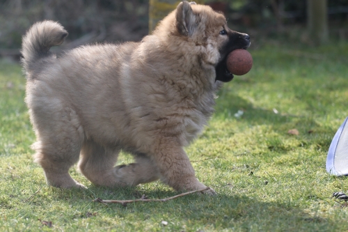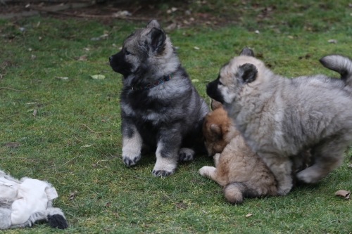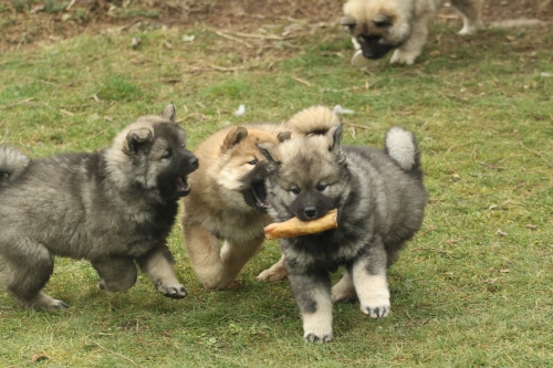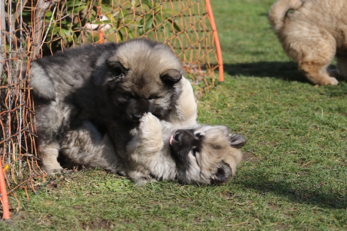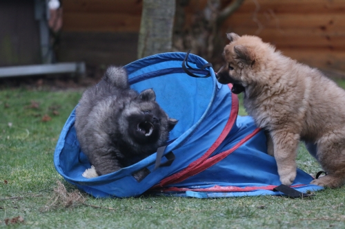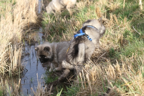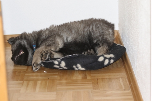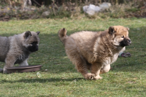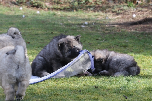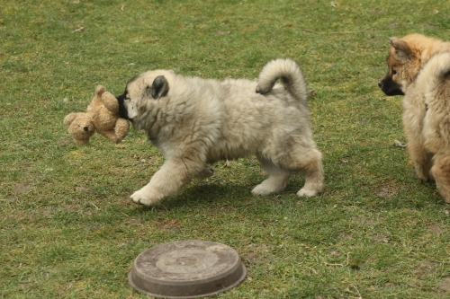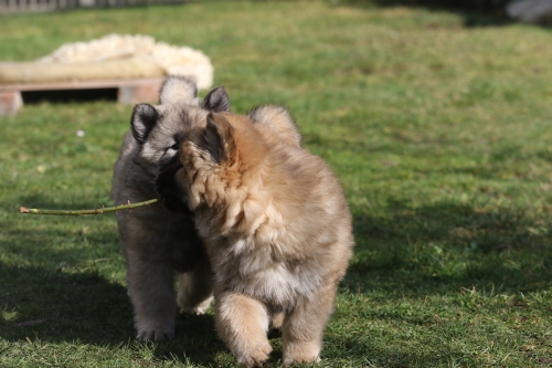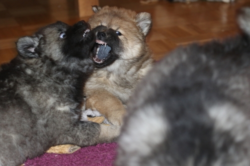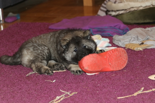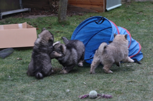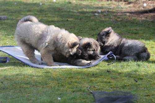 Inzwischen sind die Welpen stubenrein (bis auf ganz wenige Unfälle, wenn wir die Tür nicht schnell genug öffnen). Besonders Ayko beschwert sich sehr lautstark, wenn er mal pinkeln muss und wir das nicht gleich kapieren.