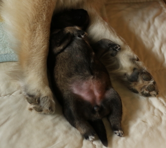 Sie schläft die meiste Zeit außerhalb der Wurfkiste, da hat sie mehr Ruhe. Den Fliesenboden nutzt sie zum Abkühlen ihrer Zitzen, die von den Vieren stark strapaziert werden.