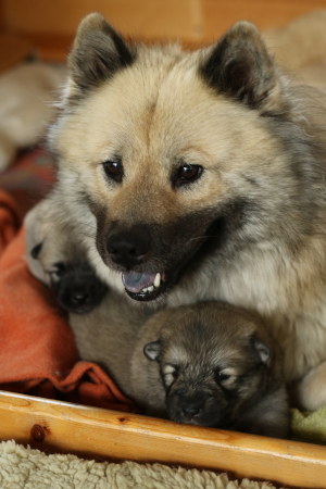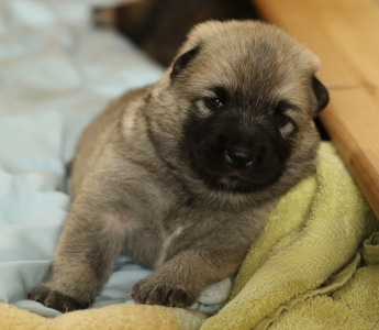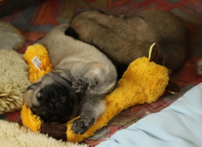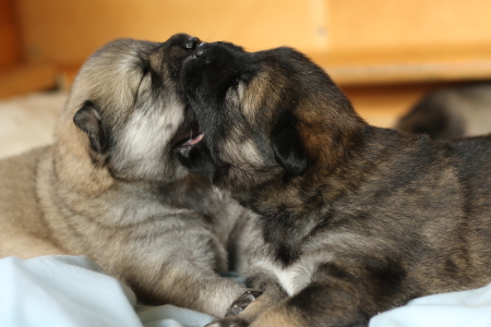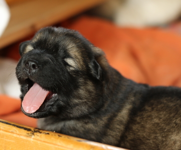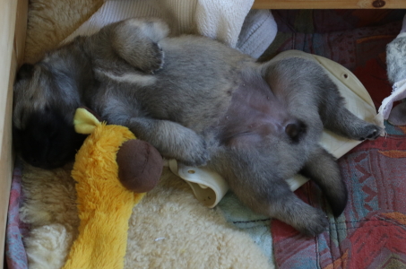 28.10.: Am Freitag abend, 26.10. schaute uns dann Cilly endlich auch an. Alle vier sind zwar noch in der Wurfkiste, aber sie schauen schon gerne über den Rand, wenn wir das oberste Brett entfernen. Lange wird es nicht mehr dauern bis sie Ausflüge im näheren Bereich der Wurfkiste machen. Spielzeug wird nun auch interessant und gerne mal beknabbert. Unter dem Zahnfleisch kann man schon die kleinen Zähnchen spüren.