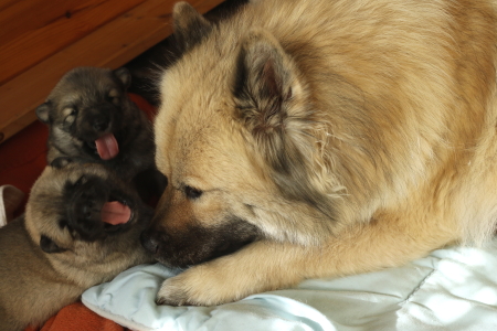 Ada unterstützt das Ganze, sie ist noch fürsorglicher als letztes Mal. Sobald man zu nah an die Wurfkiste kommt, legt sie sich in unmittelbare Nähe und passt auf. Gar nicht gut findet sie es, dass Cilly schon Ausflüge außerhalb der Wurfkiste macht und Cindy wenigstens mal ihr Häufchen ein paar Zentimeter außerhalb der Wurfkiste macht. Aber auch die Vier werden irgendwann mal selbstständig.