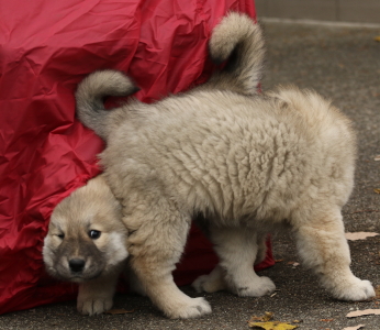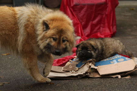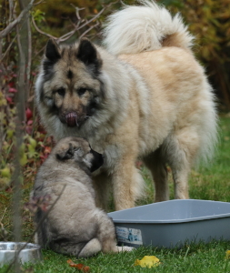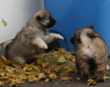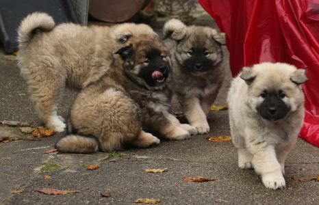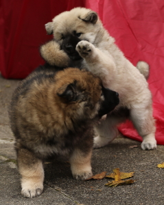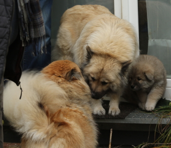 Am Wochenende haben wir viel Besuch. Mika (Baghira aus unserem B-Wurf) war noch einmal zu Besuch da. Dieses Mal waren die Kleinen auch alt genug, so dass er seine Halbgeschwister kennenlernen konnte. Zusammen sind sie stark. Da wird der große Bruder dann auch mal angebellt.