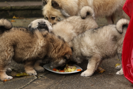 Zum Mittagessen gibt es üblicherweise etwas selbstgekochtes. Als Fleichsorten haben wir Pute, Huhn, Rind und Pferd gefüttert. Natürlich stand auch Fisch auf dem Speiseplan. An Gemüse gab es Staudensellerie (der ist auch roh toll zum Spielen), Karotten, Broccoli, Zucchini, Fenchel, Spinat, Wirsing, Süßkartoffeln, Kartoffeln und alles, was uns sonst in die Hände gefallen ist - natürlich gekocht. Rohe Karotten gibt es später zum Knabbern, wenn die Welpen älter sind. Nudeln, Reis und Spätzle gehören immer mal wieder auf den Speiseplan. Auberginen gibt es bei uns nicht, das Morgens, Abends und Nachts gibt es Welpenfutter. Hier nehmen wir Morgens Nassfutter, Abends und Nachts Trockenfutter. Sie fressen alle gut und man sollte meinen, sie werden davon satt. Leider ist Ada nicht unserer Meinung, deswegen teilt sie üblicherweise ihr Frühstück mit den Kleinen - sie schlingt es also hinunter, holt alle zusammen und würgt es ihnen wieder vor. Hoffentlich hört sie das bald wieder auf. Das rote auf den folgenden Bildern ist ein Kriechtunnel, den wir den Kleinen hingestellt haben. Anfangs sind sie nur darauf herumgesessen.