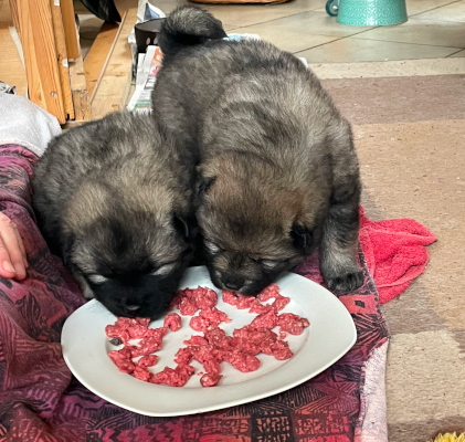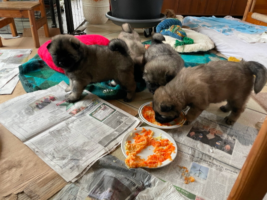 Diese fünfte Woche begann am Donnerstag natürlich wieder mit dem Entwurmen. Da die Kleinen sehr gut fressen (auch wenn sie immer noch an Cookie hängen), konnte ich das Wurmmittel unter das Rinderhackfleisch mischen. Trotz rosa Pampe kam das Rinderhack gut an. Die Kleinen bekommen natürlich nicht nur Welpennassfutter, sondern auch Gemüse, Obst, verschiedene Fleischsorten, Reis, Kartoffeln, ... Ihre Verdauung soll sich nicht nur auf eine Sorte spezialisieren. Wir hoffen damit auch frühzeitig feststellen zu können, wenn sie etwas nicht vertragen.